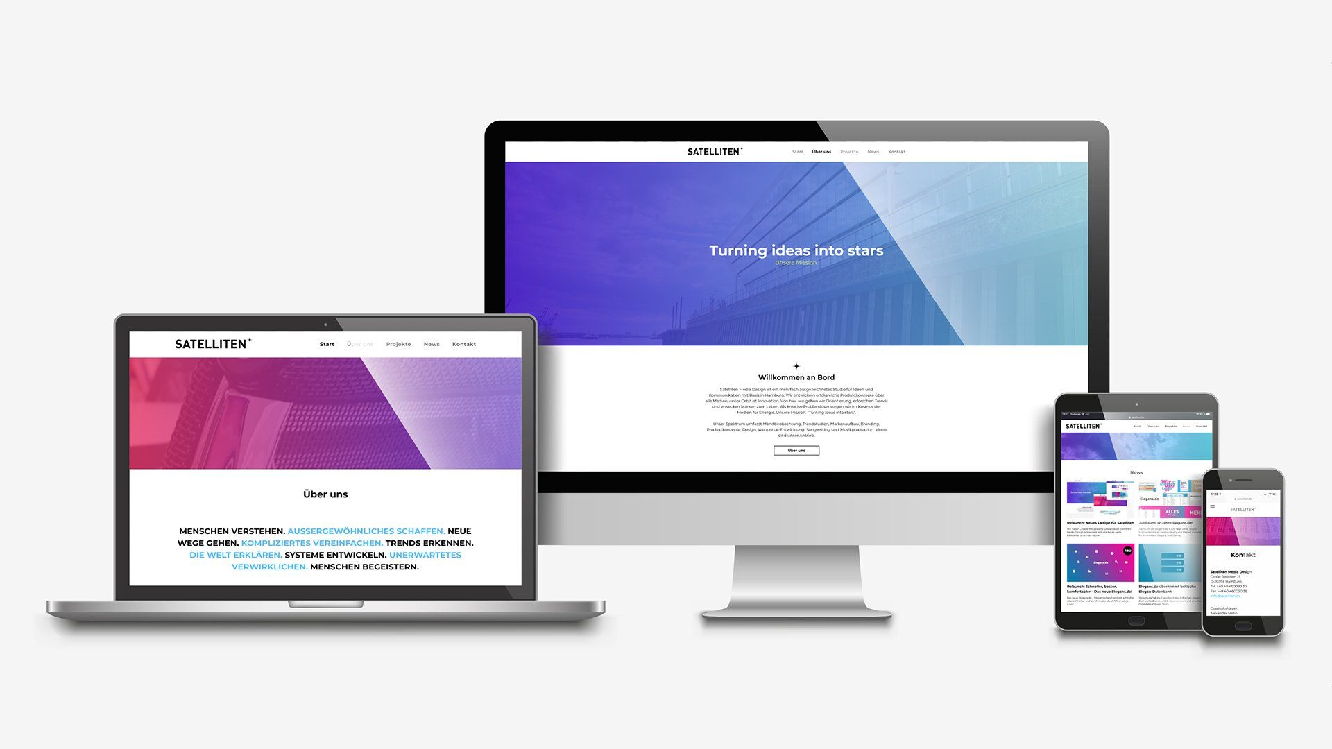 Satelliten Media Design ist ein mehrfach ausgezeichnetes Studio für Ideen und Kommunikation mit Basis in Hamburg. Wir entwickeln erfolgreiche Produktkonzepte über alle Medien, unser Orbit ist Innovation. Von hier aus geben wir Orientierung, erforschen Trends und erwecken Marken zum Leben. Als kreative Problemlöser sorgen wir im Kosmos der Medien für Energie. Unsere Mission: "Turning ideas into stars".